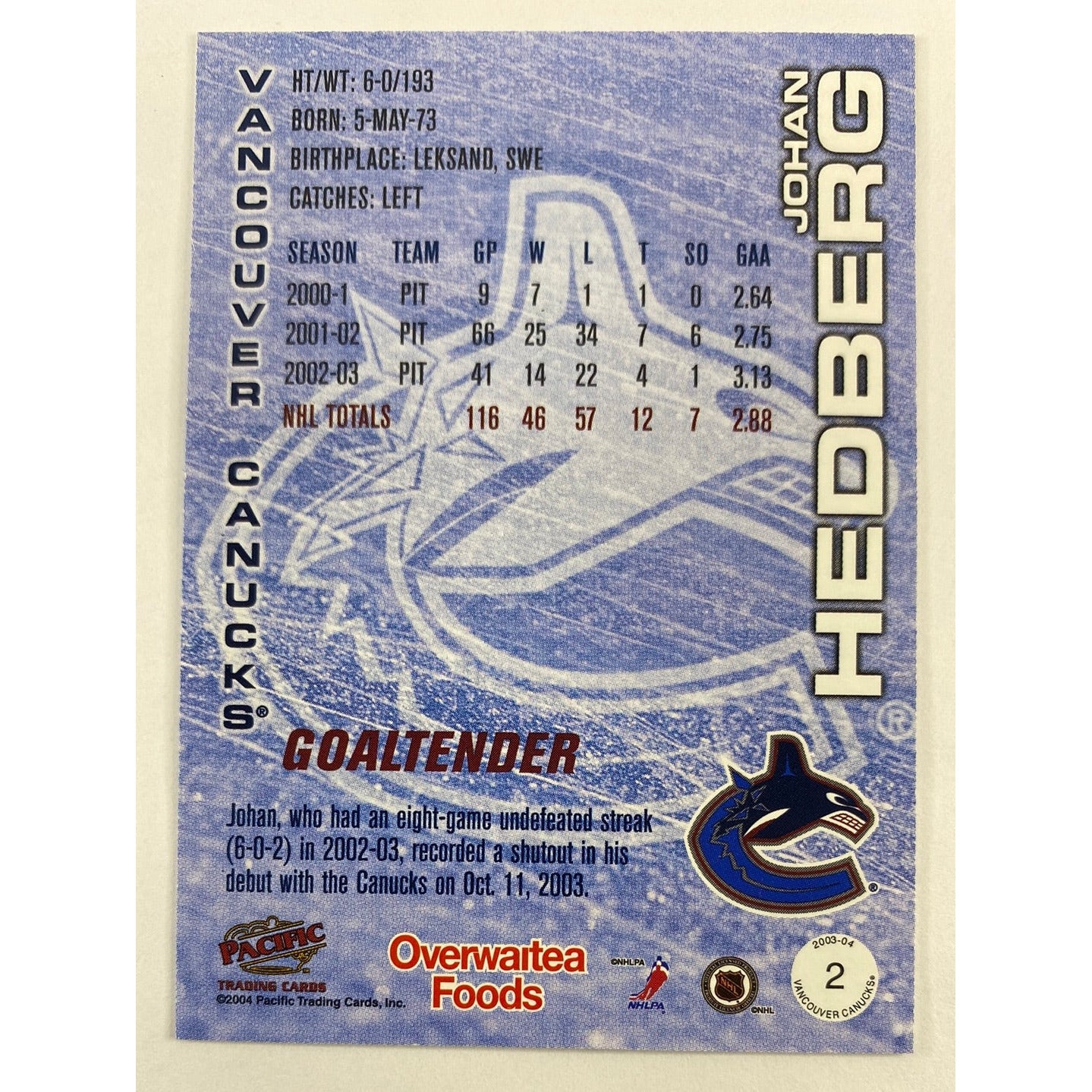 2004 Pacific Vancouver Canucks Johan Hedberg