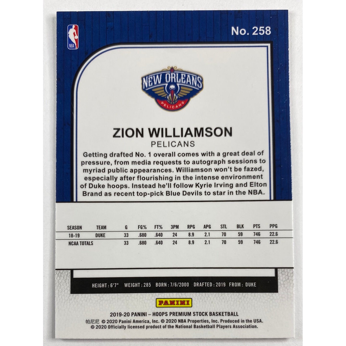 2019-20 Hoops Premium Stock Zion Williamson RC