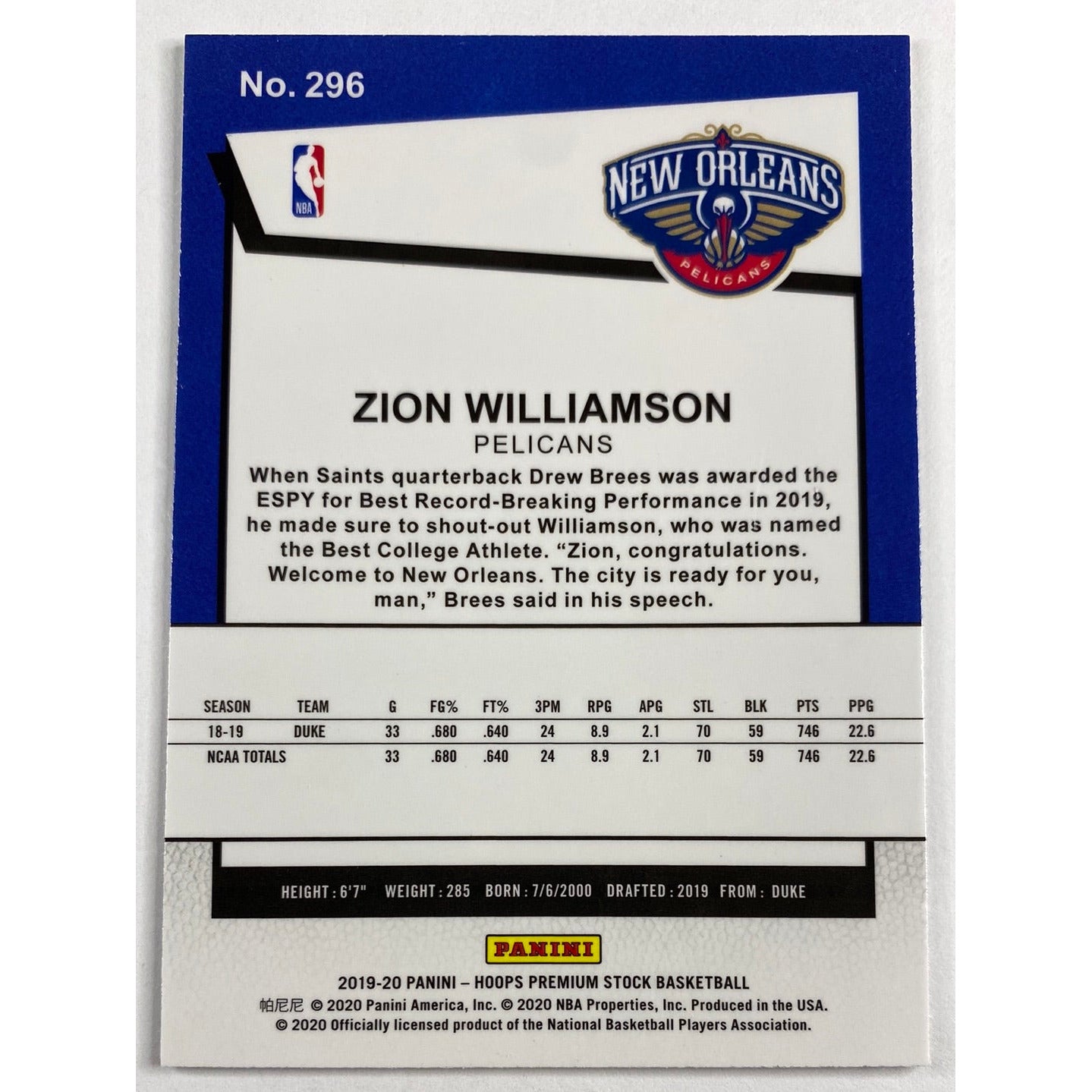 2019-20 Hoops Premium Stock Zion Williamson Tribute RC