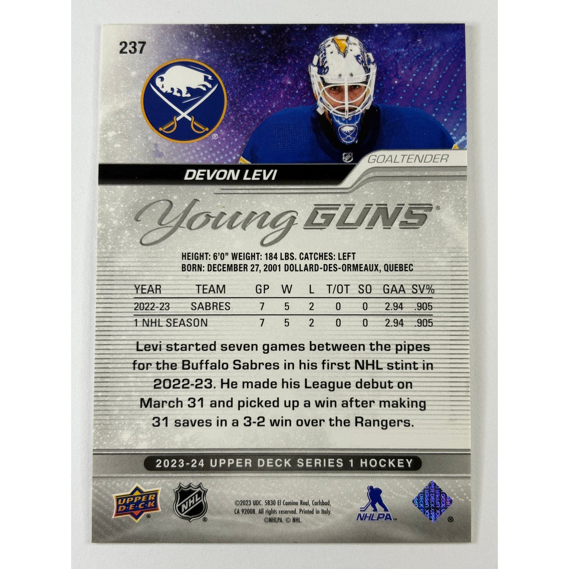 2023-24 Upper Deck Series 1 Devon Levi Outburst Young Guns