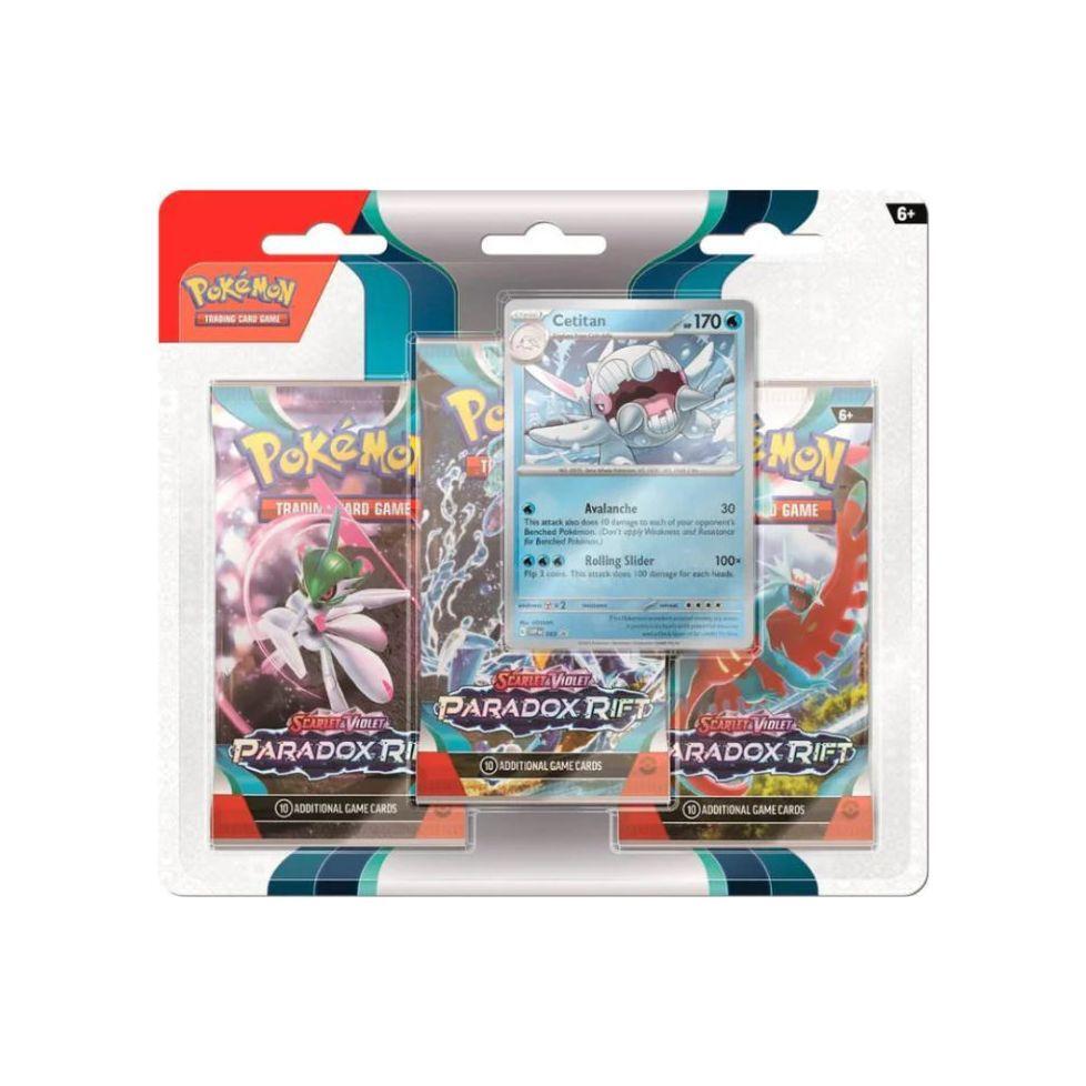 Each Pokemon Scarlet and Violet Paradox Rift 3 Pack Blister includes 3 booster packs + 1 Exclusive Promo Holo featuring Cetitan or Arctibax!